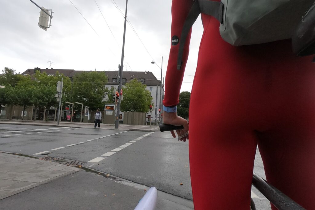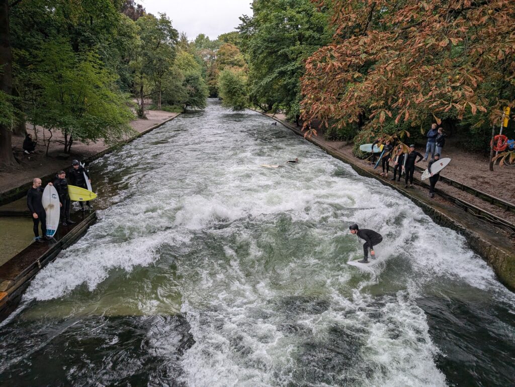 Sonntagmorgen-Surf an der E1. Es regnet und windet, und trotzdem sind fast 20 Surfer an der Welle. Die Stimmung ist gut, Zuschauer gibt es weniger, die größte Gruppe ist eine Gruppe Polizisten, die wohl vor dem Einsatz an der IAA Mobility noch ein paar Minuten Zeit haben. Kurz überlege ich, ob sie jetzt die Welle stürmen und eine Leash-Auslösemechanismus-Razzia durchführen. Aber sie wollten nur schauen.